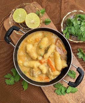 Onion – 5 Nos (Sliced), Tomato – 3 Nos.(Sliced), Green chili – 8 Nos. (Slit), Turmeric – 1 tsp, Garam Masala – 1 tsp, Ginger/Garlic Paste – 2 tbsp, Curd – 4 tbsp, Oil/Ghee – 5 tbsp, Salt – To taste, Corri-ander leaves – Accordingly.