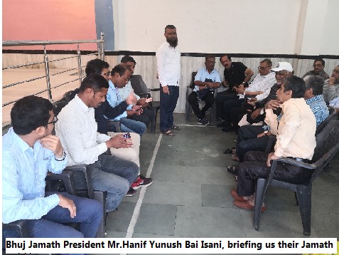Bhuj, is the center of the federation of 22 Jamaths in Kutch. Bhuj, Mandvi, Mundra, Naliya, Kothara, Vdadiya, Goyalmokhera, Memonvand, Pandhro, Mindiyari, Fulra, Gadsisa, Kodey, Shirva, Bharaper, Dahisra, Gagoder, Godhera, Kisanper, Basvav, and Khrakuva. All these Jamaths work closely together, helping each other and developing a strong bond between them. They conduct mass marriage every year which reduces the burden of marriage expenses. Their income is the rent from the shops, donations and the rent from the Jamath khana they give for functions to the memons and non-memons alike. They informed us that their Jamath is, Alhamdulillah, financially well to do and self reliant. (Some among us jokingly said before going that they may ask us for financial help - this was far from the truth).